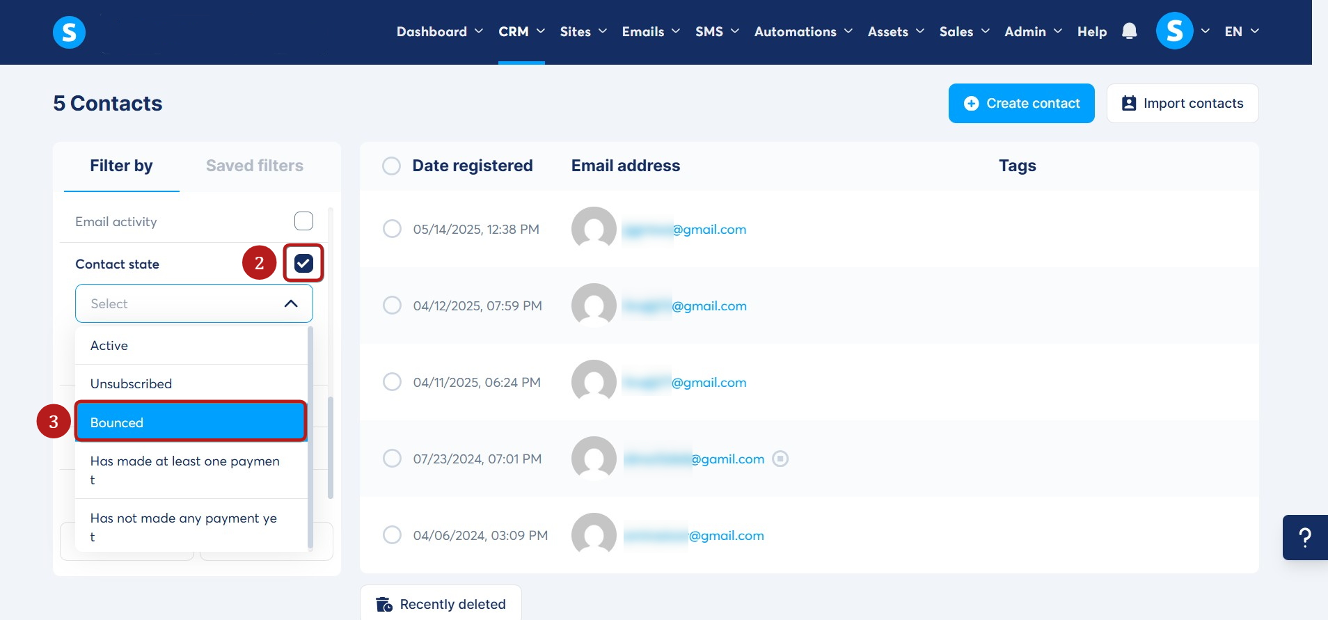 Kattintson a Kontakt állapota (2) szűrőre, és válassza a Pattant (3) opciót. A lista mostantól csak a pattant kontaktokat fogja megjeleníteni.