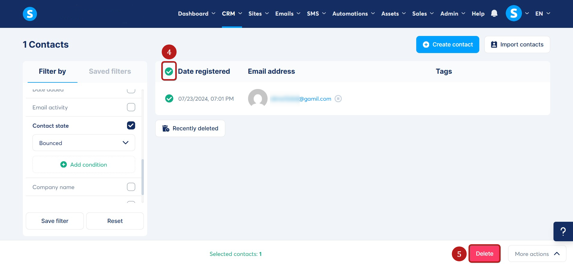 Válassza ki az összes pattant kontaktot a jelölőnégyzetre (4) kattintva, majd kattintson a Törlés (5) gombra.
