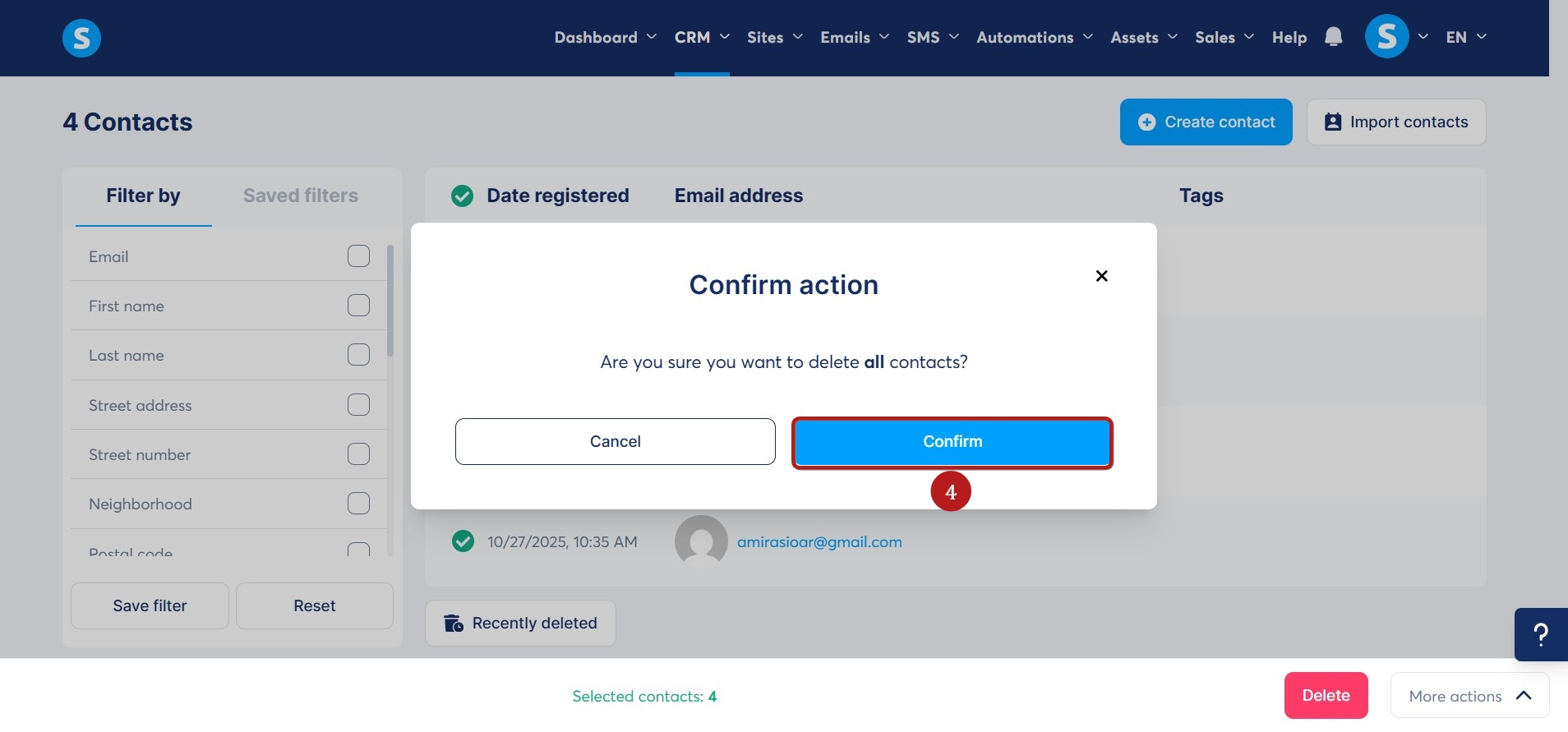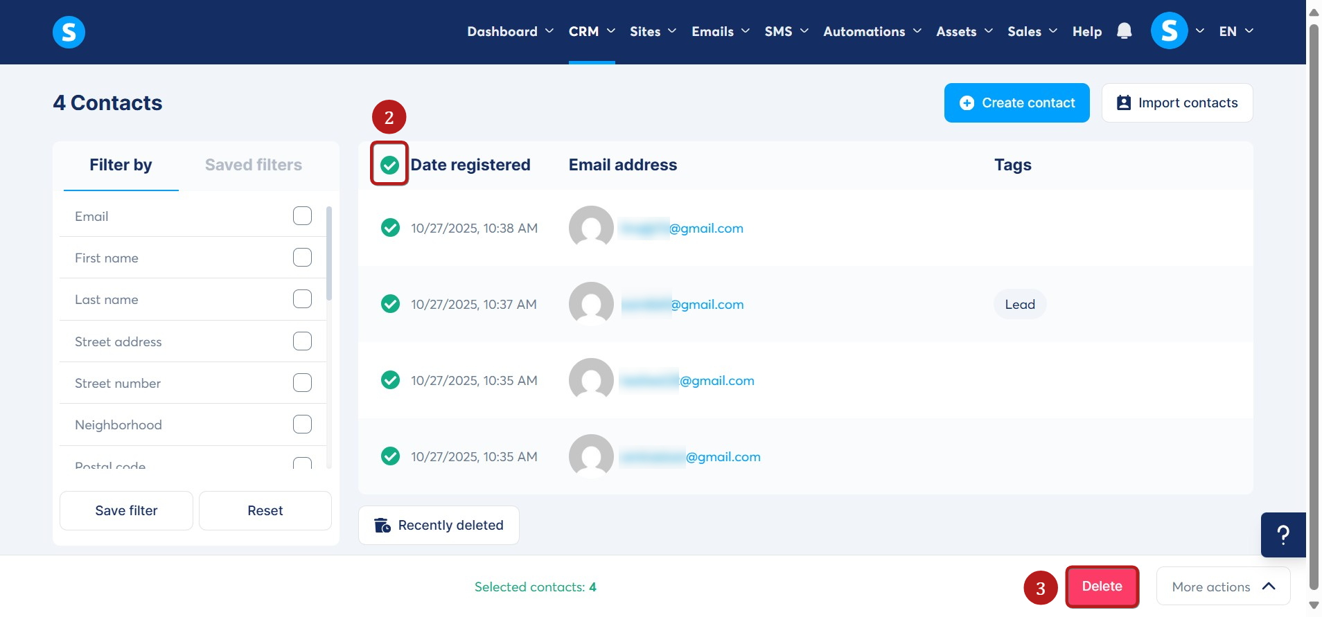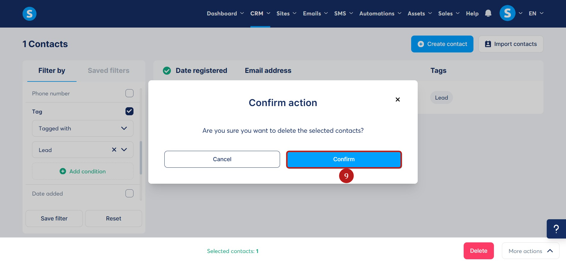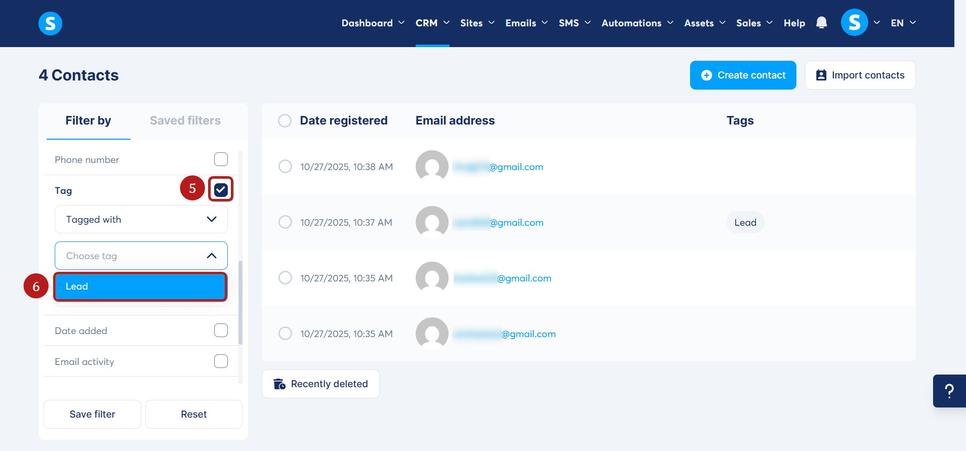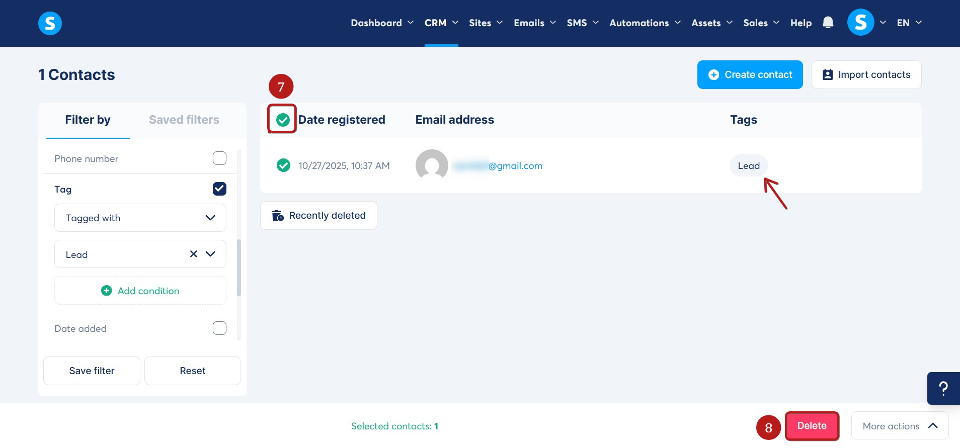 Például, ha az összes „Lead” címkével ellátott kontaktot törölni szeretné, válassza ki a Címke szűrőt (5), majd válassza ki a Lead (6) lehetőséget a címkék listájából.