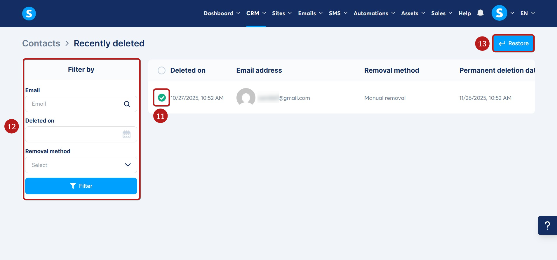 Manuálisan is kiválaszthatja a visszaállítani kívánt kontaktokat (11), vagy használhatja a bal oldali szűrőket a könnyebb megtalálásukhoz (12). Ezután kattintson a Visszaállítás (13) gombra.