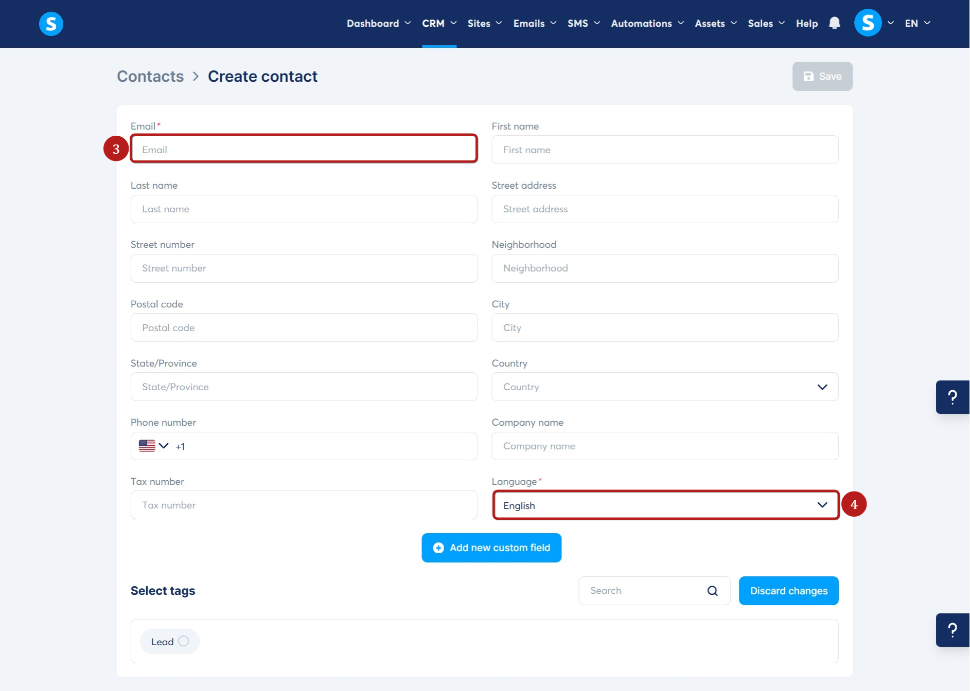 Töltse ki a kapcsolati űrlap kötelező mezőit: E-mail (3) és Nyelv (4).