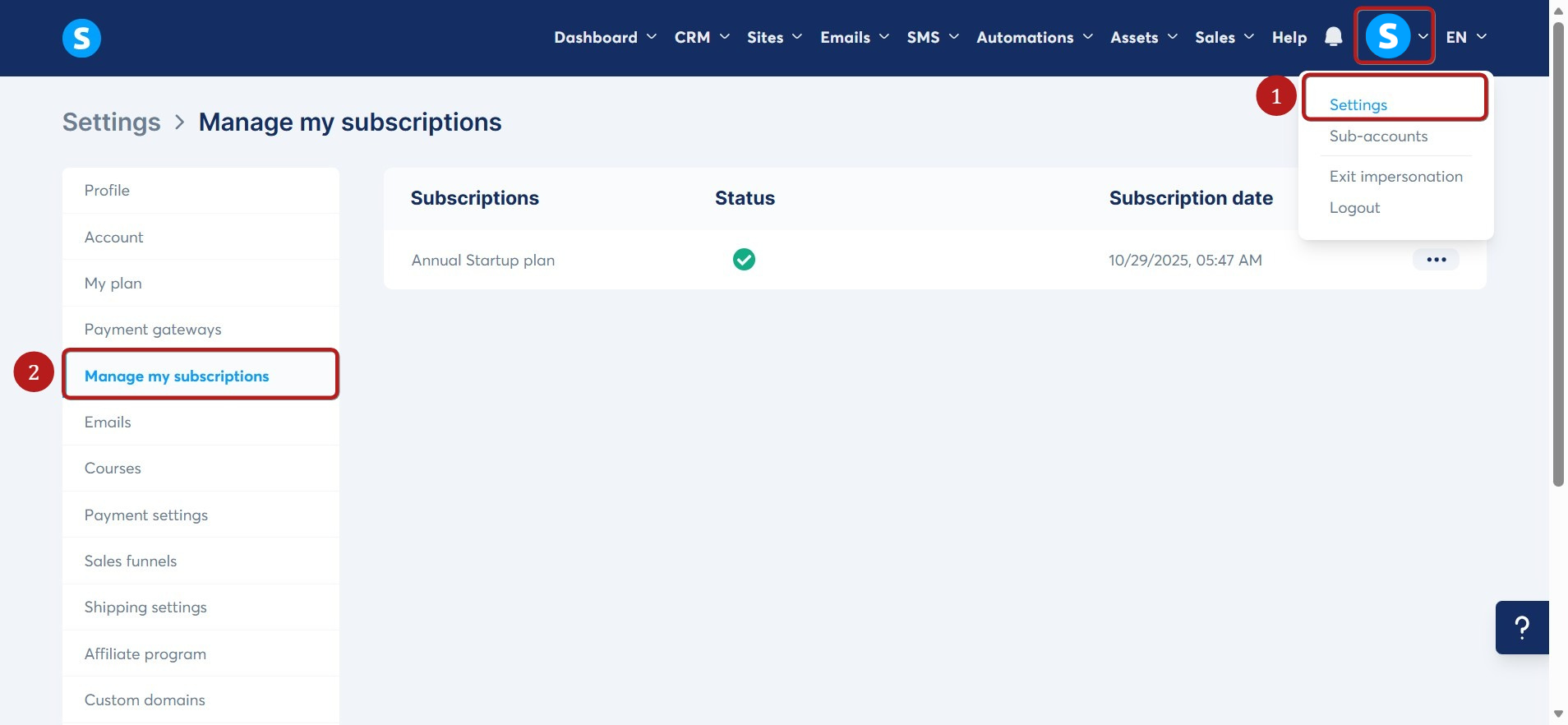Az előfizetési beállítások eléréséhez kattintson a profilképére, majd a Beállítások (1) menüpontra. A bal oldali menüben kattintson az Előfizetéseim kezelése (2) lehetőségre az előfizetések listájának megjelenítéséhez.